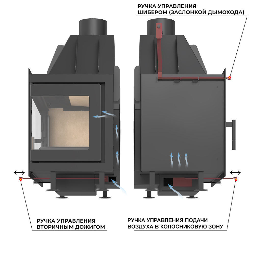 Все элементы управления выведены на переднюю поверхность самой каминной топки, и наличие облицовки никак не сказывается на удобстве обслуживания топочной камеры.