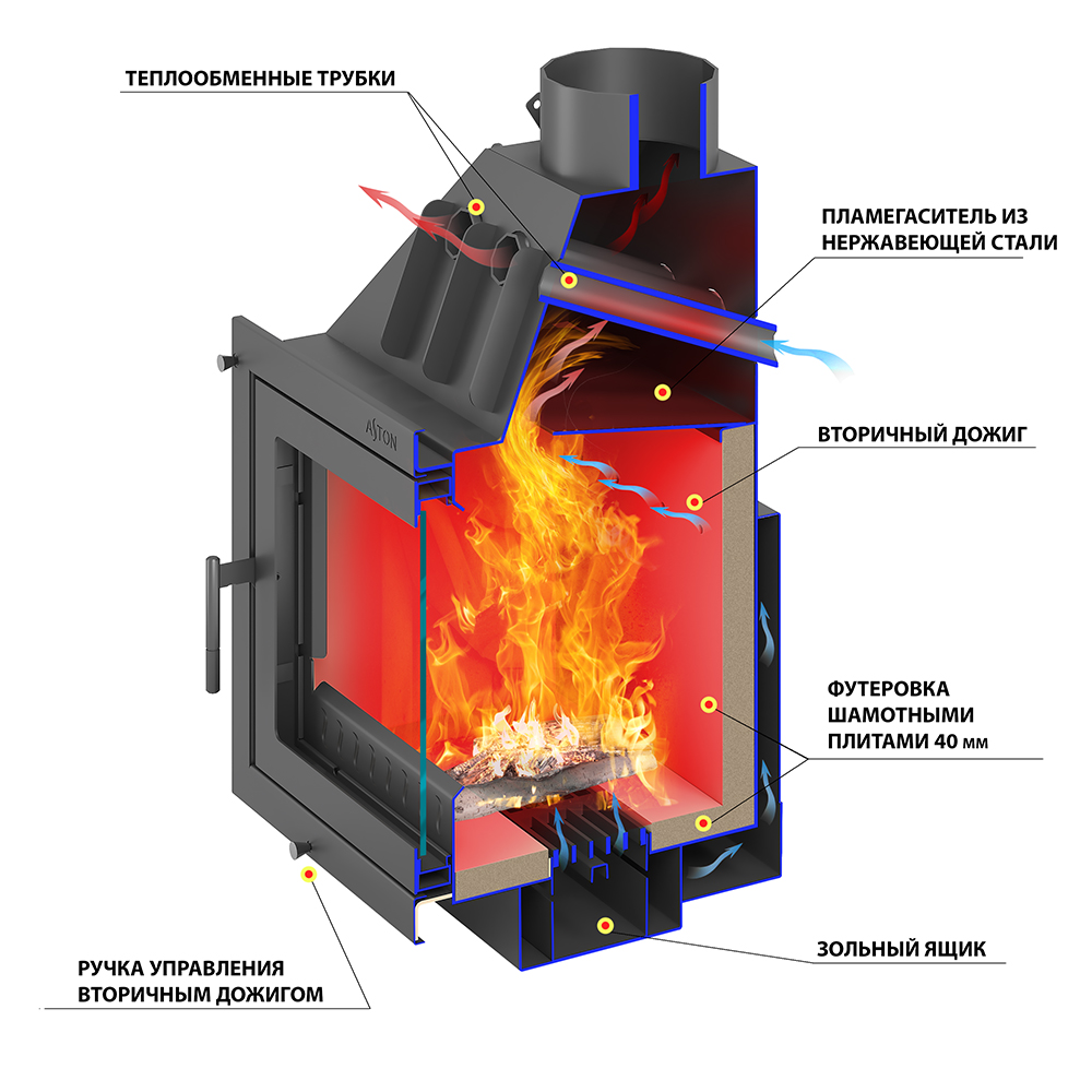 Топка Астон 700 внутри облицовки размещается на подставке. Топка, подставка и облицовка отлично походят друг к другу и не требуют дополнительной подгонки. Свободное пространство между топкой и облицовкой предназначено для движения нагретого воздуха. Именно за счёт конвекции быстро нагревается пространство, что уже в первые минуты работы топки обеспечивает тепло в помещении.