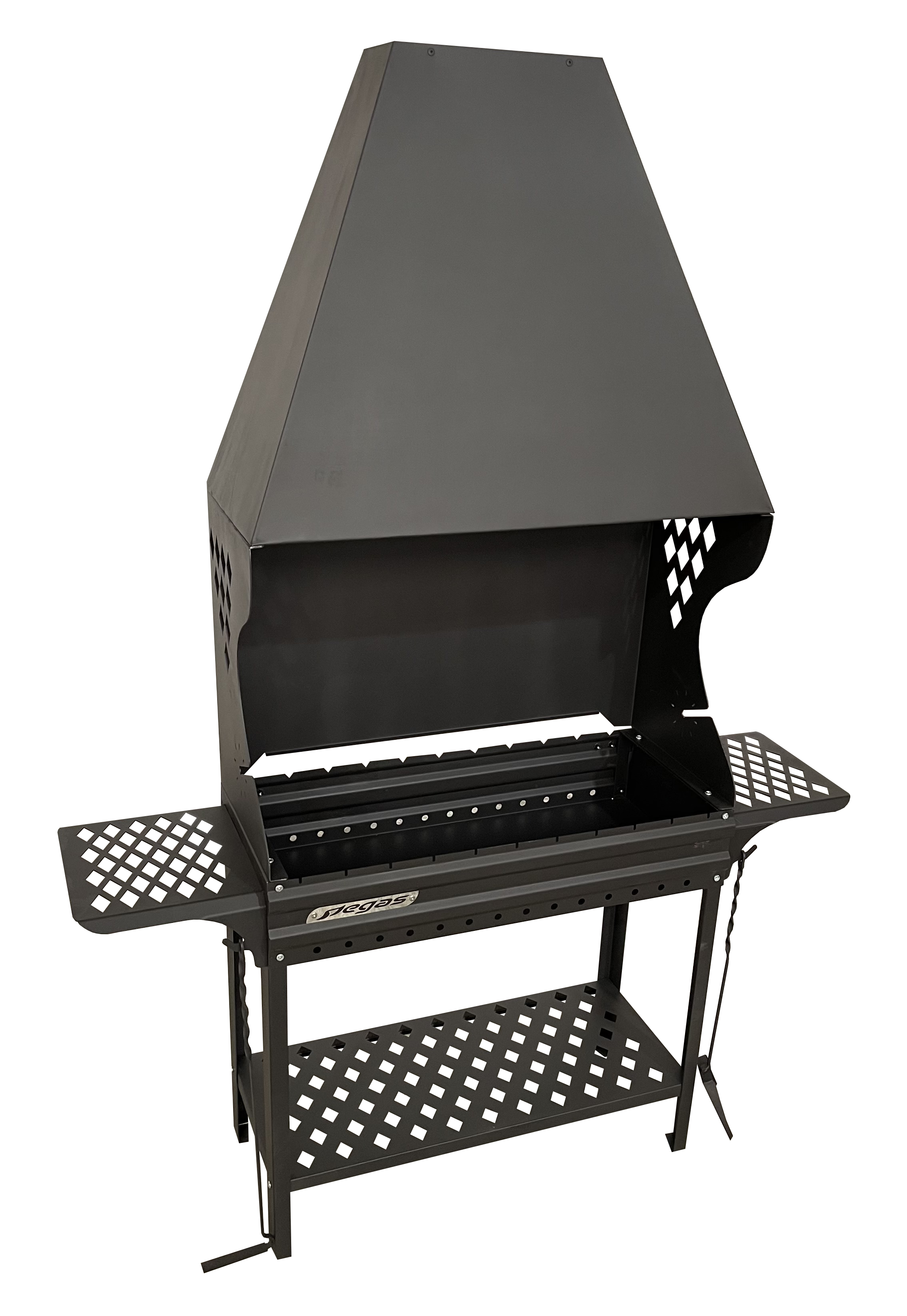 Особенностью мангала является внешний дизайнерский вид, съемные боковые столики, боковые отверстия обеспечивают оптимальный приток воздуха для поддержания горения и жара и углей.Нижняя полка позволяет удобно и компактно хранить все необходимые материалы и подручные средства..