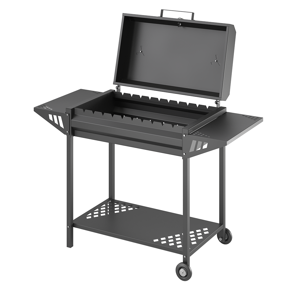 В боковых стенках предусмотрены гнёзда для укладки шампуров. Одновременно на мангале можно готовить до 10 порций продуктов.