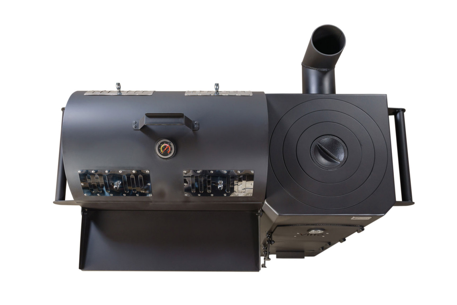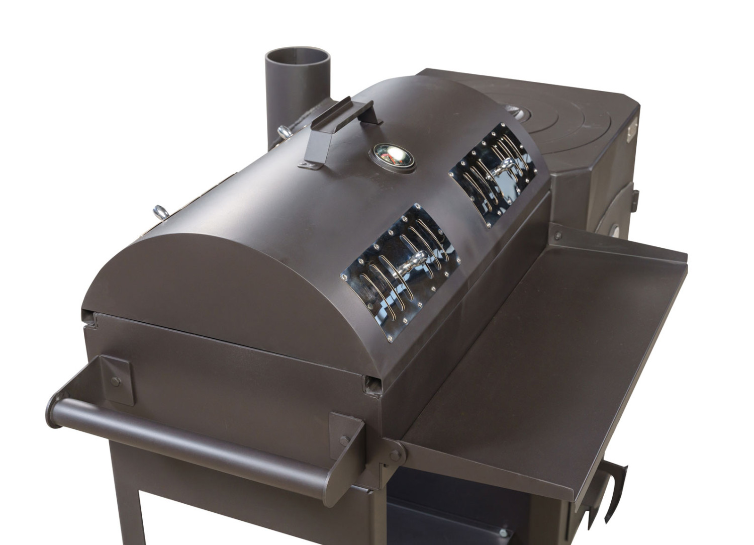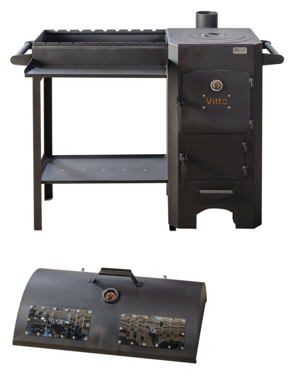 Духовка/Коптильня укомплектована двумя решетками и жиро сборником из нержавеющей стали, а также механическим термометром.