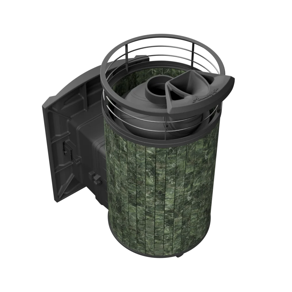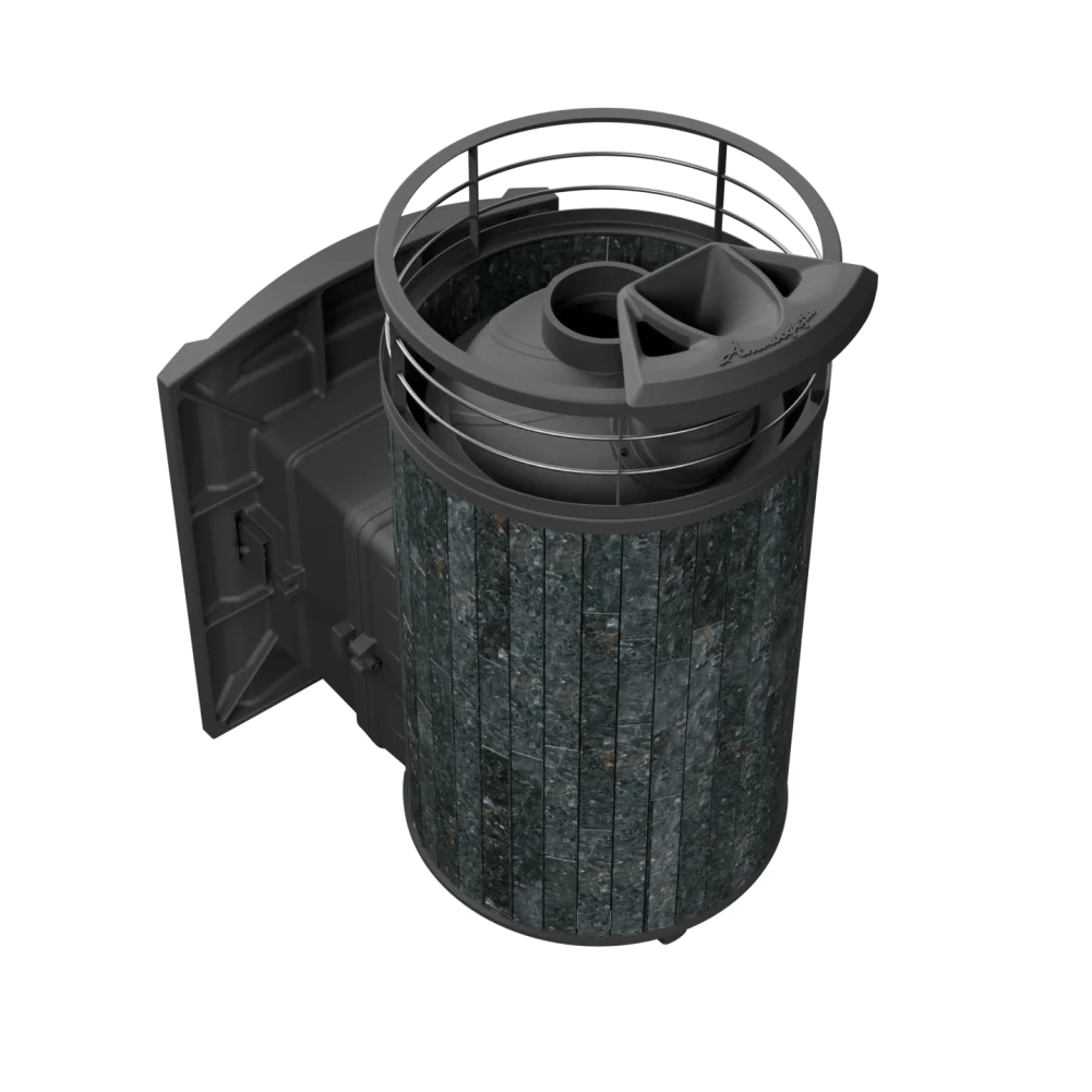 Печь для бани Атмосфера в ламели из натурального камня по периметру внешней каменки не только обладают хорошими теплонакопительными свойствами, но и придают печи оригинальный внешний вид.