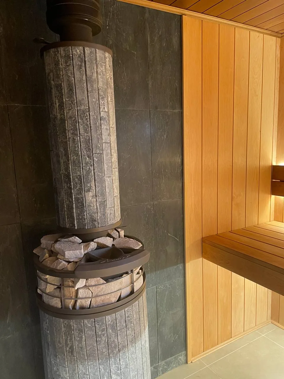 Печь банная «Атмосфера » Талькохлорит ламель+сетка с тоннелем +Сетка-каменка ламель.Установлена в парной.Отделка Вагонка и полок - ольха и термоольха.